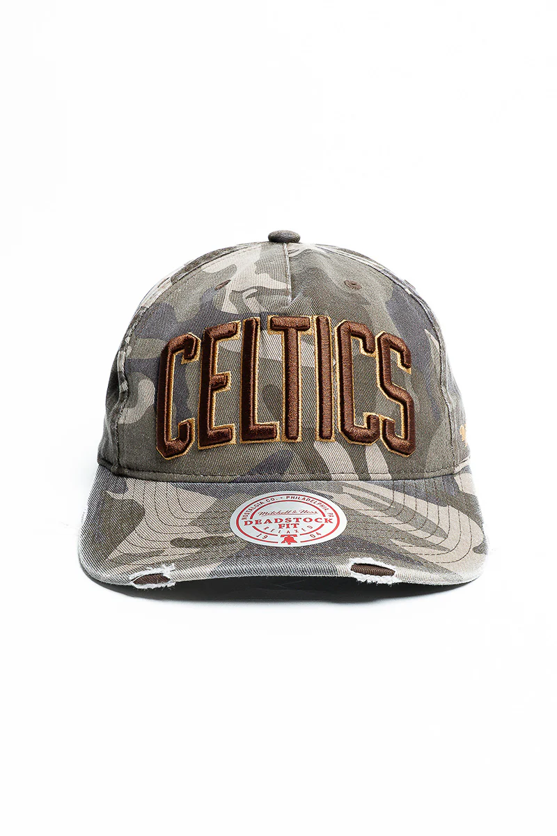 Blend street-ready edge with team pride in this Boston Celtics Distressed Cap. A rugged camo base meets brown bold embroidered lettering, outlined in rich gold for a standout, premium finish.