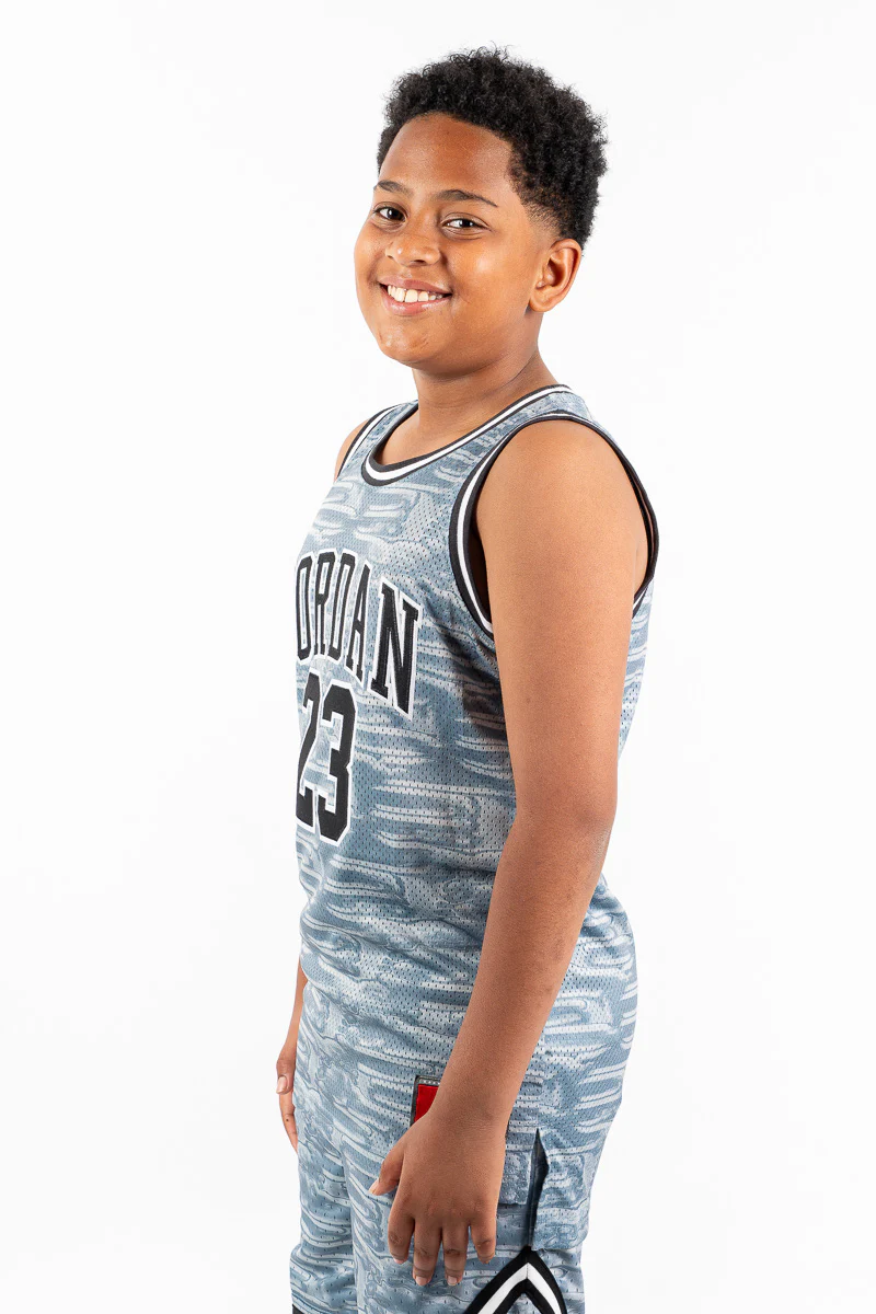 Step up your street-wear or game-day look with the Jordan 23 AOP Youth Jersey in Aviator Grey. Featuring an all-over print that captures Michael Jordan’s legacy, this sleeveless jersey brings high performance and high style in equal measure. The aviator grey base lends a versatile, modern edge — perfect for layering, matching, or standing out.