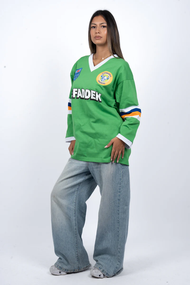 Celebrate a classic era of rugby league with the Canberra Raiders Retro Jersey, inspired by one of the club’s iconic heritage designs. Featuring the Raiders’ signature green colourway with vintage sleeve striping, this jersey captures the look worn during the club’s early and most memorable years. The retro McFadden sponsor print and heritage NSW Rugby League badge add authentic throwback detail, while the traditional V-neck rugby league collar completes the timeless silhouette. Perfect for Raiders supporters and collectors who appreciate the rich history of the Green Machine.
